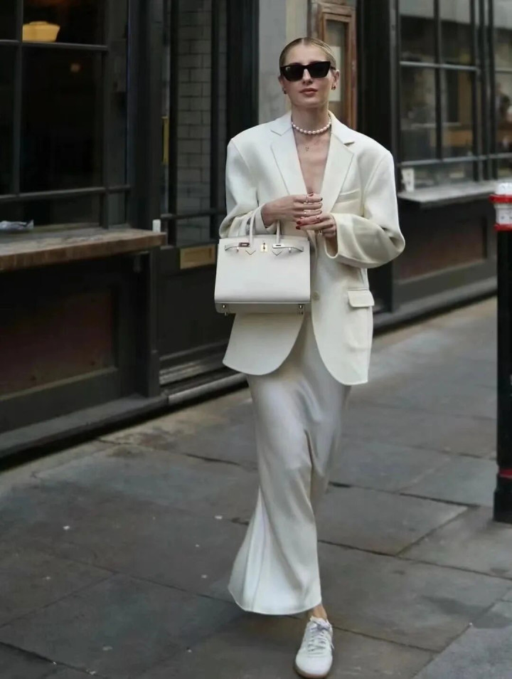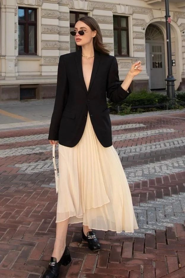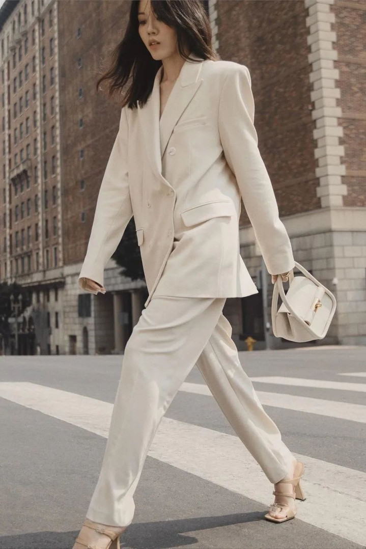 配百褶裙,那是简约的雅致;搭缎面裙,那就更绝——裙子的柔把西服的挺给中和,又仙又带点攻气;配高跟鞋是温柔,换成运动鞋就是洒脱,不管怎么穿都不呆板。