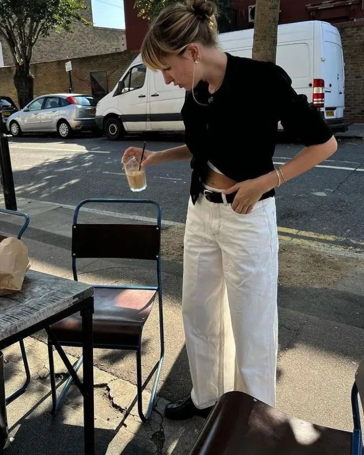 配高腰牛仔裤是街头的飒,搭碎蕾丝裙又多了点反差的媚。
